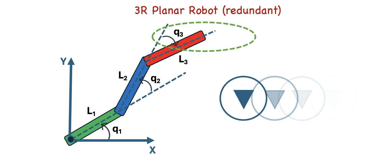 This project focuses on redundancy resolution for a 3R planar robotic manipulator. In simple terms, redundancy resolution means choosing the best joint configuration when multiple solutions can achieve the same end-effector motion. The choice depends on the task objective.